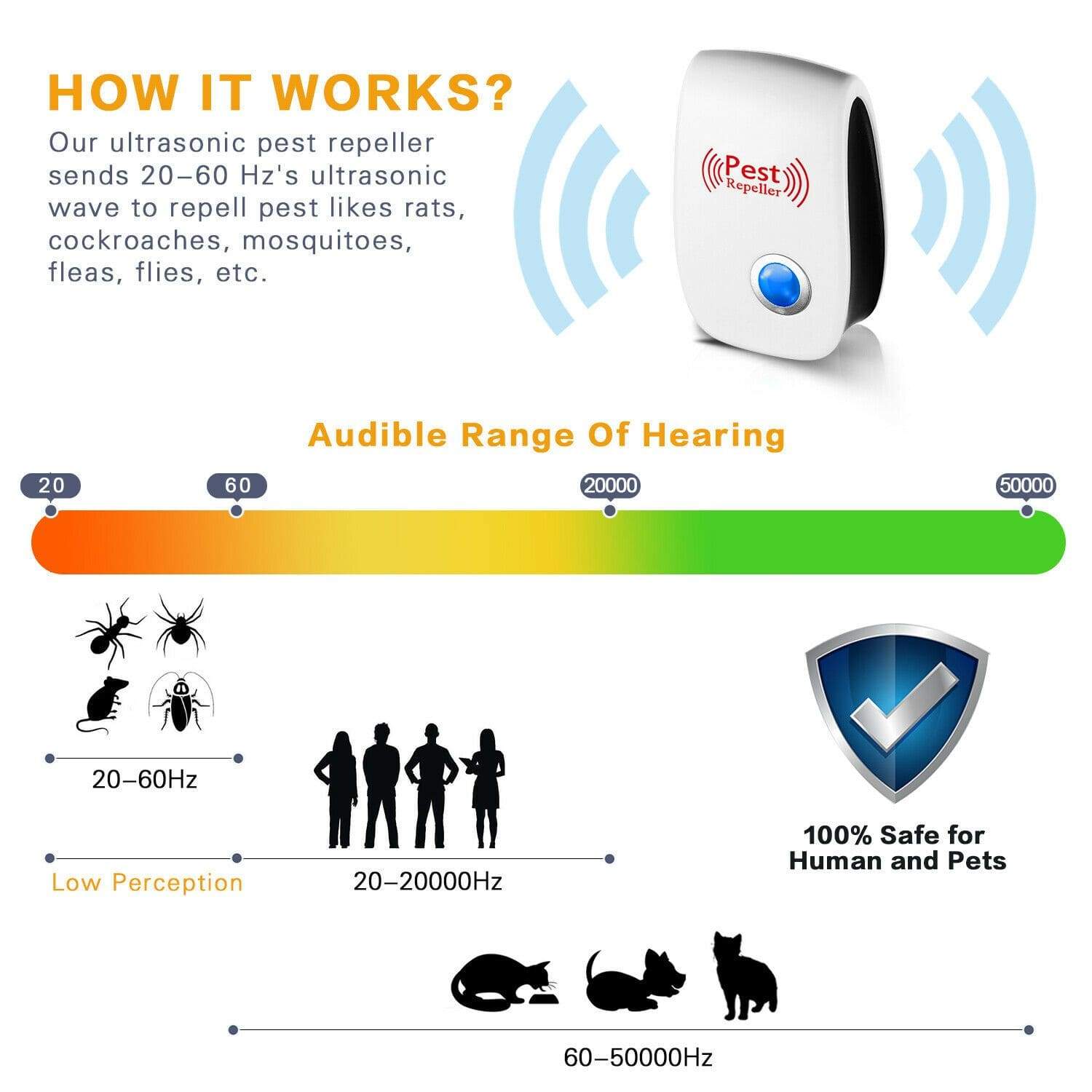 Advanced Dual-Technology: Pest Reject combines electromagnetism and ultrasound, providing a powerful solution to drive away various pests like ants, roaches, and rodents effectively.